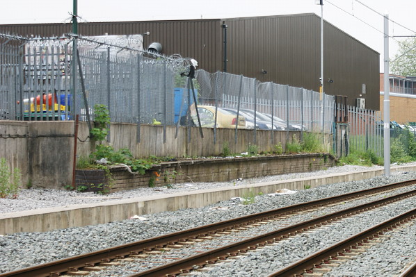 The northern end of the former Manchester direction platform of Chorton-cum-Hardy station could still be seen in June 2012. The route of the Midland Railway had by this time become part of a Metrolink tram line. The tram line however had been laid a few metres to the east of the original alignment.