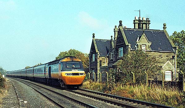 Photo by Ben Brooksbank ![]() In October 1988 the 10.40 Edinburgh – London Kings Cross is operated by a Class 43 Inter-City 125. It is speeding through the disused station at Christon Bank, whose splendid building is seen on the right.