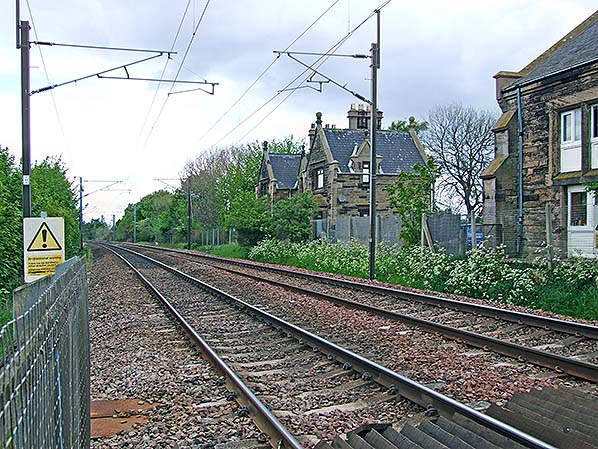 ![]() Looking north from Christon Bank level crossing in May 2009. The East Coast main line was electrified in 1991. To the right of the railway tracks the main building of the disused station is centre right while the old goods shed is on the extreme right. Both are in residential use,
