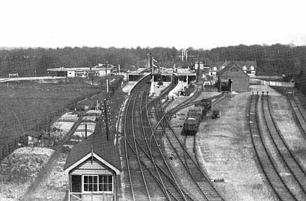 Christ's Hospital Station in April 1923 - picture taken from the top of the up home signal. The Guildford line platforms are on the left.