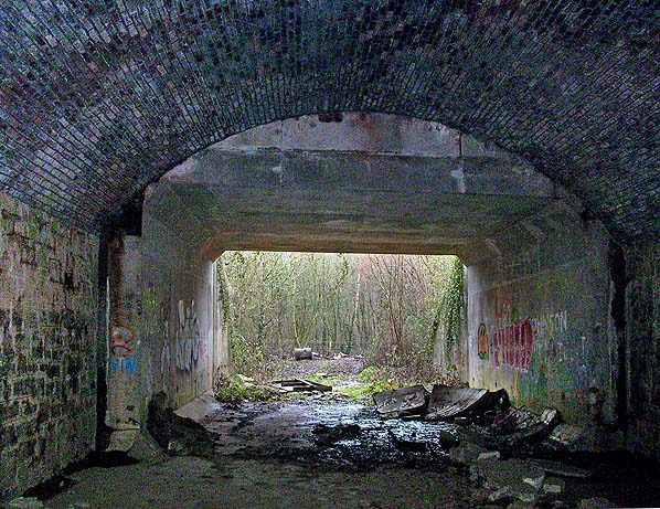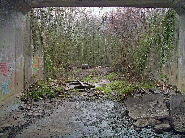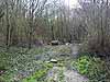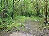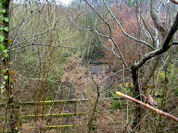 ![]() Looking south at the site of Chudleigh station in January 2009. The old A38 has now been widened across the north end of the station site and now forms part of a junction with the new A38. The trackbed through the station remains intact although it has been bisected by the Kate Brook a small tributary of the River Teign. Its confluence with the Teign was moved north closer to the bridge, crossing the trackbed in the trees seen in the middle distance. The station building was on the north side of the Kate Brook. The south end of the platform and the goods yard were largely on the south side.