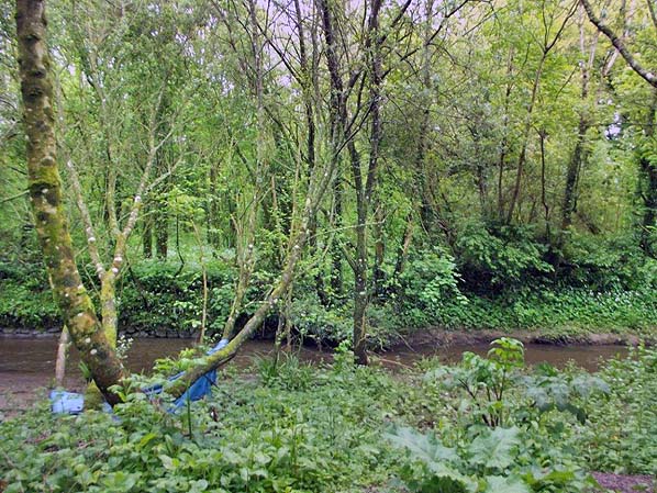 Photo by Neil Bromley ![]() Looking south from the site of Chudleigh station in May 2014. The station building was behind the photographer. The Kate Brook now flows through the site of the goods lock-up. The bulk of the goods yard, including the goods dock, was on the far side of the Kate Brook.