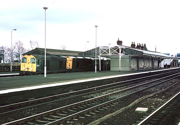 Two BR Class 20 diesel locos with 20070 in the lead hauling a freight train through platform 2 at Church Fenton station in April 1985.