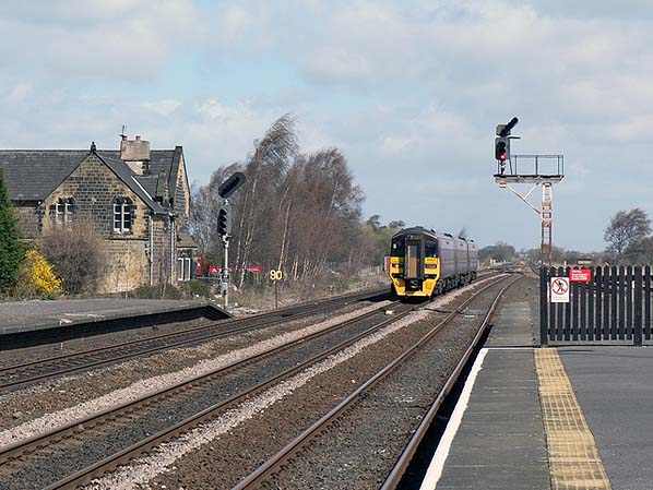 A TransPennine Express approaching from York passes through Church Fenton station on its way to Leeds and beyond in April 2006. The station building from the second Church Fenton station