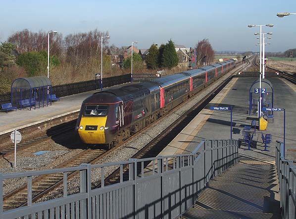 An HST hauls the 09.43 Newcastle-Plymouth service through Church Fenton station in February 2011.