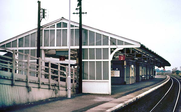 Church Fenton station looking north at the central island platform (platforms 2 and 3) in July 1973. This platform had a wide selection of buildings including waiting rooms, toilets and a newsagent's shop. BR(NE) tangerine signs giving platform numbers are in place alongside Corporate Identity black-and-white signs carrying the station’s name. The buildings were demolished in 1990
