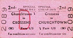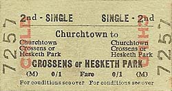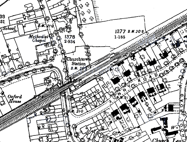 ![]() ![]() Churchtown station on an 1890 OS Southport town plan. The map shows how the booking office was at street level and the platforms were on an embankment. Note also the tramway passing directly in front of the station; trams provided direct competition with the WLR.