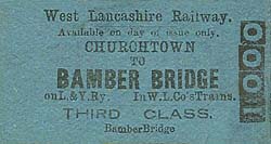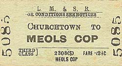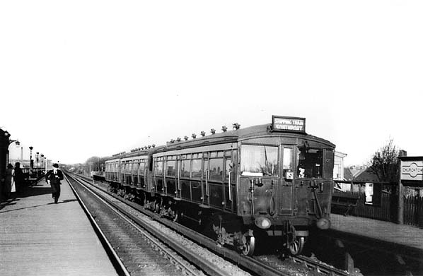 ![]() A Crossens to Southport Chapel Street EMU of LYR vintage arrives at Churchtown station on 17 April 1939. The EMU was of a type built to operate on through services between the Liverpool - Southport line and the Liverpool Overhead Railway. This service was short-lived and the EMUs found their way onto Southport and Crossens services. A railway employee can be seen racing along the down (Preston-bound) platform, presumably in an attempt to reach the station exit in time to collect tickets from any alighting passengers.