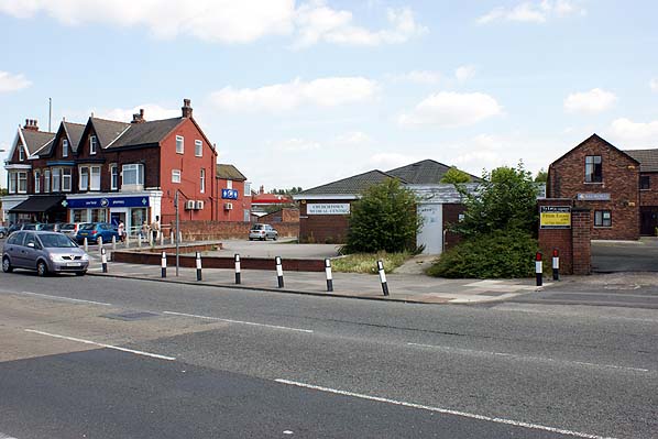 Photo by John Mann ![]() Looking north-east at the site of Churchtown station in July 2011. The station booking office had been to the left of the yellow and black sign. The station platforms had been above street level on an embankment.