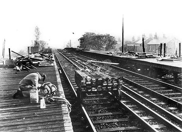 Photo by D. Hampson ![]() Looking north-east along the down (Preston-bound) platform at Churchtown station in late 1964 or early 1965. Demolition of the station's platforms was underway.