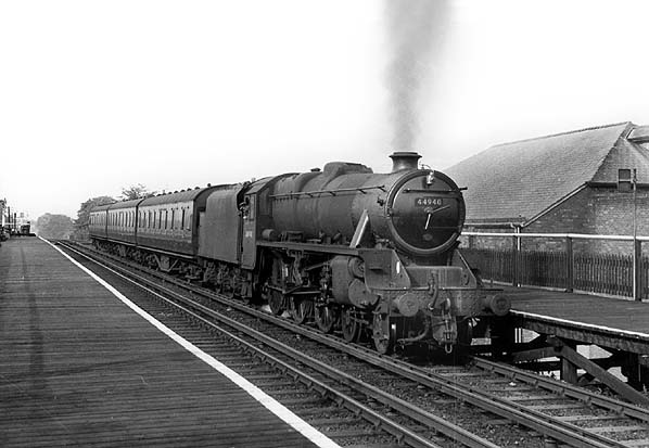 Copyright photo from Stations UK ![]() The 09:30 Southport to Preston service hauled by ex-LMS Class 5MT (Black 5) locomotive number 44940 arrives at Churchtown station in August 1964. The station was on an embankment and was provided with wooden, rather than masonry, platforms to keep their weight to a minimum. This picture was taken from the up (Southport-bound) platform. Three coaches make an easy load for this Black Five, and it looks as if all is well in the cab, with the fireman taking it easy! 44940 was one of a batch of 14 Black Fives built at Horwich works and entered service in November 1946 at 26A, Newton Heath shed numbered 4940. After spells at 24B, Rose Grove and 10C, Fleetwood sheds, it moved to 9B, Stockport Edgeley shed in February 1966, from where it was withdrawn in March, 1968 and scrapped at Drapers of Hull in August of the same year.