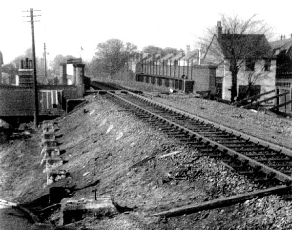 Photo by K G Rose ![]() The south-west- end of Churchtown station in March 1965. The timber platforms had been removed leaving only the stone supports as evidence that there had been a platform at this location. To the left of the picture the footpath led down to the station’s street-level building, the rear of which is visible adjacent to the bridge.