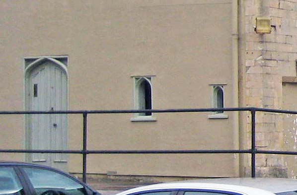 ![]() Station Name: CIRENCESTER TOWN[Source:Peter Stephenson] ![]() A close-up of view of the bottom right hand corner of the western side of the building in April 2014. The hand rail is round the replacement platform. Behind it can be seen a Victorian Gothic door and two windows in the same style.