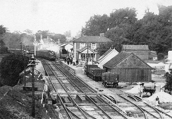 Copyright photo from John Alsop collection ![]() ![]() 1904 1:2,500 OS map shows the original track layout. To the east of the station a single siding served the coal yard; coal bins are seen in the centre of the yard. The cattle dock is seen immediately west of the station building with a siding running either side. Cattle pens are seen on the dock. The goods shed is seen to the left of the dock; one siding passes through it, another passes in front of it. A well is shown at the end of Station Road, just inside the yard.