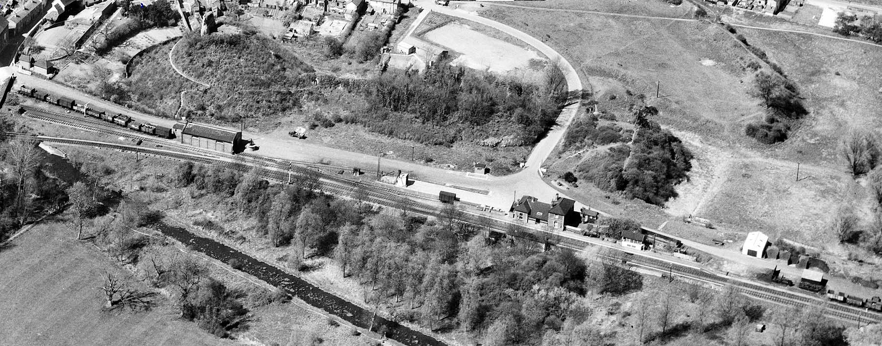 ![]() The west end of Clare goods yard in April 1953, One siding passes through the goods shed and splits into two sidings on the west side of the shed loaded coal wagons are seen here. Another siding passes in front of the shed. The small building at the west end of the shed was the goods clerk's office. The 1 ton 10 cwt yard crane is seen at the east end of the shed. Out of view on the north face of the shed there are two large opening accessed by a raised platform for loading goods from road vehicles. The main entrance to the yard was from the station forecourt but there was also a secondary entrance onto Malting Lane which is seen on the left. Clare Castle motte and the remains of the keep are seen at the top of the picture. The main entrance to Clare station and goods yard is along Station Road which is seen coming in from the north. Turning right into the goods yard there is a weighbridge and an adjacent weigh office. To the west of the main station building the cattle dock is seen with sidings running both sides. Cattle pens are seen at the west end of the dock. The 'H' shaped station building is seen with a canopy between the two end wings partially filled in with wooden panels. The down side waiting shelter can be made out on the other platform. To the east of the station building the Clare signal box is seen on the platform. Clare coal yard is at the east end of the station and comprises a single siding; seen here in April 1953 with loaded coal wagons and coal bins to the rear. Two large wooden storage sheds are also seen. Within a few years these sheds would be demolished and the siding realigned. Reproduced with the kind permission of Simmons Aerofilms Ltd ![]()