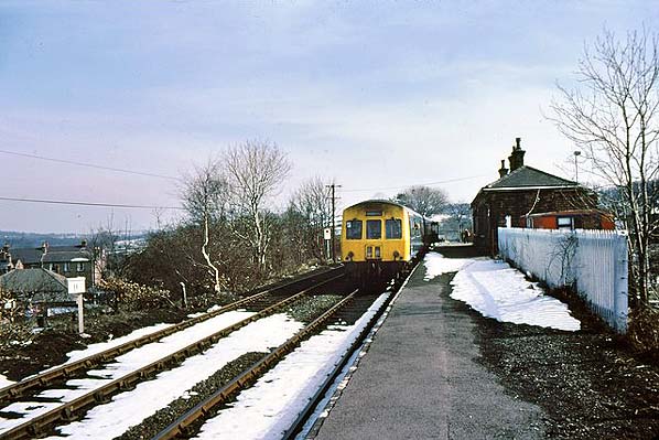 A DMU for Huddersfield is about to depart from Clayton West station in April 1979.