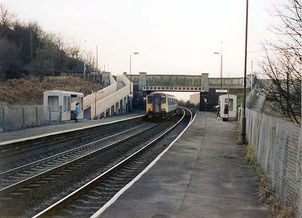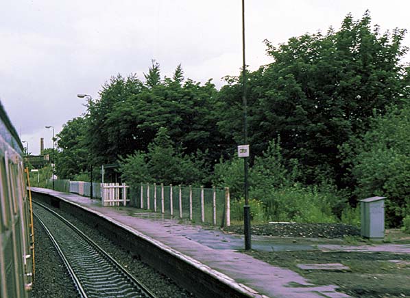 platform has been demolished. Photo by Alan Young ![]() Looking northwest along the up platform of the Manchester and Bolton route at Clifton Junction station in May 1989. A train can be seen heading northwards through the station. By this date the station had been reduced to a simple halt with bus shelters replacing the original waiting shelters. The original cobbled access road can be seen on the right.
