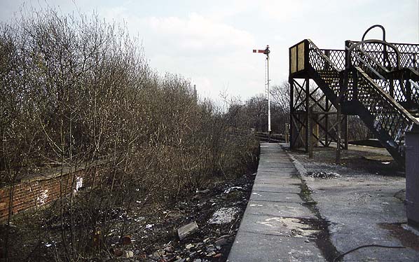 platform in April 1984. The Pepper Hill signalbox up section-signal Photo by Paul Williams ![]() Looking north at Clifton Junction station in July 1985 seen from a passing Bolton train. The main station building seen in the picture above has now been demolished although the brick shelter is still there. Further to its right and in the trees on the right the Accrington route platforms are extant although heavily overgrown. The platforms have now been shortened and this section of