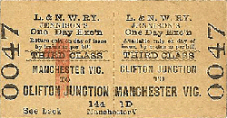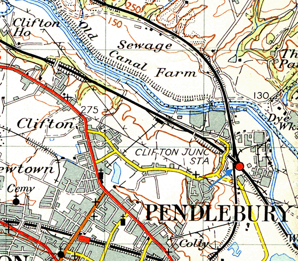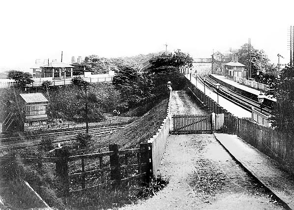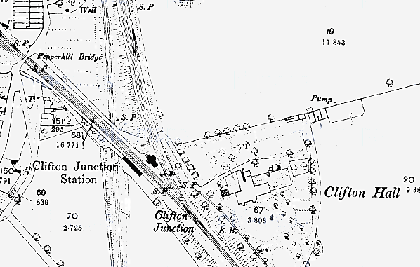 ![]() Looking south at Clifton Junction station c. 1910. The picture is looking along driveway which led to the main station building (and under the platforms on to Clifton Hall) which was behind the trees in the centre left of the picture. To the right can be seen the platforms that served the Manchester and Bolton line. In the bottom left a line can be seen which passes beneath the Manchester and Bolton route. This line ran to Eccles and provided a link between the Accrington line and the Liverpool and Manchester Railway. Above it can be seen the platforms that served the Accrington line. To the left of the picture out of view the Eccles line would have joined with the Accrington route. The signalbox on the left is Molyneux Junction aqnd that on the right is Clifton Junction.