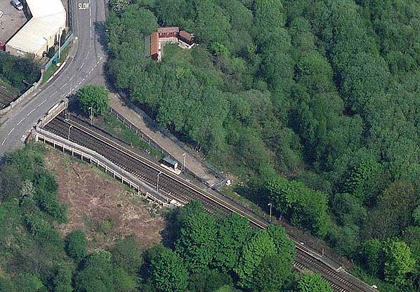 Photo by Whatlep, reproduced from Geograph under Creative Commons Licence ![]() An aerial view of the much reduced facilities at Clifton station. The platforms in the picture serve the Manchester and Bolton line and have been shortened. To the right of the picture in the dense woodland the platforms that had served the Accrington route were extant in November 2010. The original cobbled access road is clearly visible although now truncated.