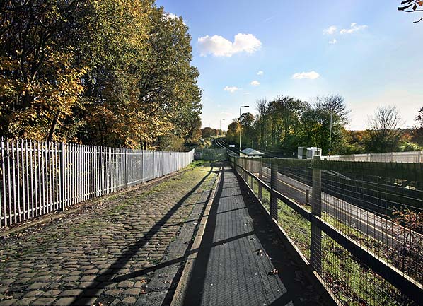 Photo by Nick Catford ![]() The original cobbled access road from Rake Lane in November 2011. This is still used for acces to the up platform on the Manchester to Bolton line. Beyond the bus shelter the cobbled road has been removedm it used to continue to the main station building close to the junction and also went under the Acrington line platforms to serve Clifton Hall.