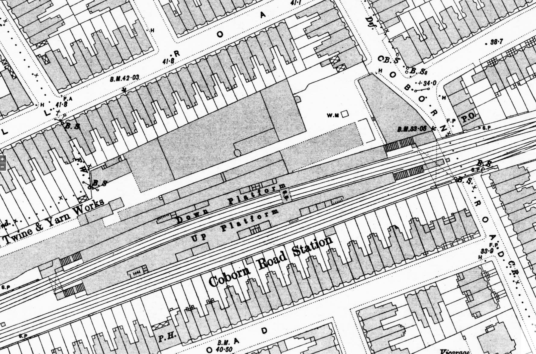 1896 1:1056 OS Town Plan shows the layout of the station. The main entrance was on the north side of Coborn Road with the booking office located in an arch below the viaduct. A wide subway is shown beneath the four lines with steps up to the two platforms. Further steps at the west end of the station lead to another subway, this time running under only two lines, The Grove Road booking office is at the north side of the subway from where a footpath runs parallel with the viaduct for 250ft to Grove Road. Buildings are shown on both platform: two on the down platform and four on the up platform. Gents' toilets are located at the west end of the down platform building and the east end of the up platform building. A signal box spans the tracks between the two platforms. No platform canopies are shown although they were in place from the opening of the station. The two avoiding lines run to the south of the station.
