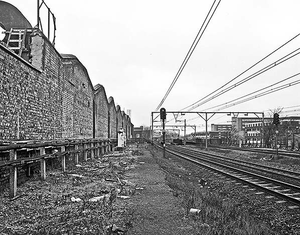 ![]() Station Name: COBORN ROAD FOR OLD FORD![]() Looking east along the degraded down platform at Coborn Road station in December 1984. Coborn Road bridge is seen in the middle distance; the first Coborn Road station was on the far