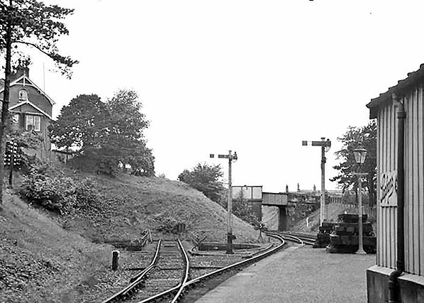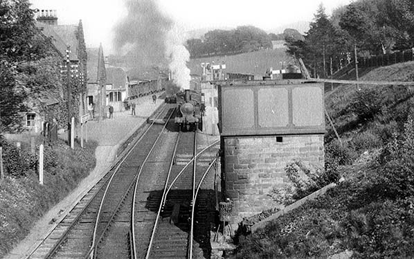 Photo from Syd Ridley Jr and John Mann collections ![]() Looking south-east towards Cockermouth station from Station Road bridge in 1931. The tank in the foreground supplied the engine shed behind the down platform where locomotives would have been watered. The adjacent carriage shed can just be made out next to the signal on the right. The station's turntable is hidden from view by the tank. The locomotive standing at the down platform is a Webb 2-4-2T and possibly of the 4ft 6in variant; the picture quality does not allow more detailed identification. Note the cattle wagons in the siding behind the up platform.