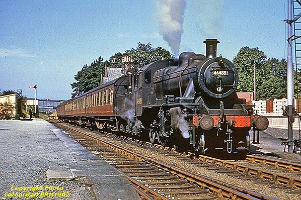 Photo from James Lake collection ![]() In August 1955 Ivatt Class 2F 0-6-0 No.46488 is seen at Cockermouth station’s up platform bound for Keswick and Penrith. The station building appears beyond the carriages. A modest timber waiting shed is seen on the down (island) platform. The locomotive was built in 1951 and spent its life at 12D, Workington shed until it was withdrawn in 1965 only months before the line through Cockermouth closed. There would appear to be railway enthusiasts present – see the heads protruding from carriage windows - no doubt to witness what was thought, falsely as it turned out, to be the end of steam on the line. The rolling stock is all of ex LMS Stanier origin. The first three are wearing the 1948-56 Carmine & Cream (unofficially Blood & Custard or Plum & Spilt milk) livery and this tells us that the first three vehicles are corridor stock. The brake is the vehicle immediately behind the locomotive (note the fireman atop the tender with his shovel - he would be shifting coal forward). The last two vehicles are again ex LMS but are wearing Crimson Lake livery, which latter tells us they are non-corridor types. Crimson Lake was a shade of red used by the LMS for its local stock and was perpetuated for a time by BR for certain non-corridor loco-hauled stock until replaced by the 1956 maroon livery and in a few instances by BR Rail Blue.