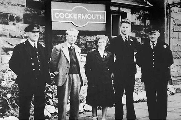 Photo from John Mann collection ![]() Station staff pose below the LMS 'Hawkseye' sign at the west end of the up platform. They are from L - R Billy Hartley, Richard Sanderson and Philys Williams. The other two are unknown. Photo from Barbara Scales Click here for Cockermouth Station Gallery 3: