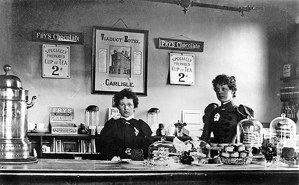 [Source: Alan Young] Cockermouth Station Gallery 2: pre-1914 - c.1960 ![]() The counter and staff in Cockermouth station’s refreshment room probably shortly before World War 1. Thirsty passengers may avail themselves of a ‘specially prepared’ cup of tea for 2d and an alluring range of cakes is displayed under glass domes.