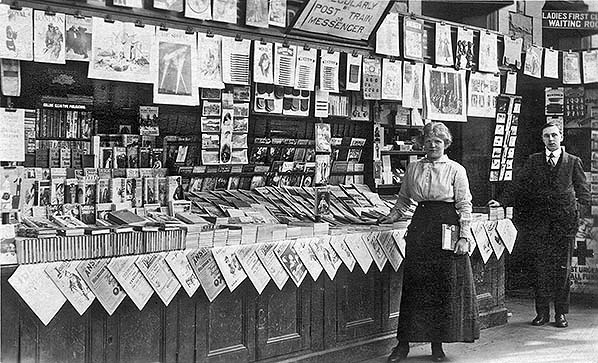 Copyright photo from John Alsop collection ![]() An exquisite study of the bookstall at Cockermouth station in 1916. The clarity of the photograph enables us to see the range of books, magazines, picture postcards and stationery offered to passengers. ‘Railway Magazine’ Edition 225 of March 1916 is on the stall and ‘The Sphere’, which ran a series of articles on Zeppelin raids, is for sale; its edition of 5 March 1916 seen here covers the operation of searchlights. Extraordinary care has been taken with preparing the display. (Thanks to Darren Kitson for researching this information from the Railway Magazine and British