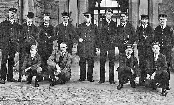 ![]() Cockermouth station staff assembled at the entrance c1918. Standing, L-R: An unidentified tall figure wearing traditional CK&P jacket and green corduroy trousers and prominent CJS (Cockermouth Joint Station) lapel badges; An S&T inspector (with bowler); T Armstrong (porter from 1901); John Vickers (in service since 1900); Robert Little (Stationmaster 1891-1921; A tall porter; Mark Allinson (signalman); Thomas Arthur Ridley; Jack Stanley (signalman). Kneeling, L-R: Son of Reg Litt; Reg Litt; Bill Hartley; Percy Sanderson (Clerk).
