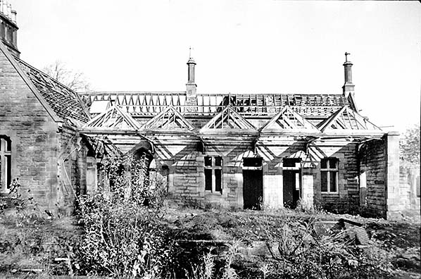 Cockermouth station building seen from the down platform in November 1975 during demolition. The waiting room is seen devoid of its timber and glass front.