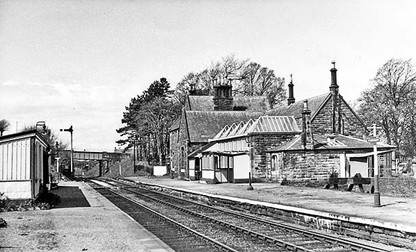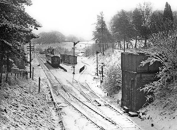 ![]() Looking east from Station Road bridge at the snow-clad Cockermouth station on 2 April 1966, a fortnight before the passenger service through the station was withdrawn. A DMU for Workington stands at the down (island) platform, adjacent to the timber shelter. The water tank on its stone plinth is seen far right.
