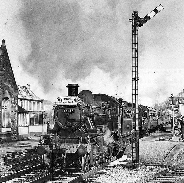 Photo from Lynda Braithwaite (Joe Carruthers was Lynda's great uncle) ![]() On 2 April 1966 the SLS/MLS ‘Lakes and Fells Rail Tour’ was the final steam-hauled passenger train to traverse the entire Penrith – Workington line, and it ran a fortnight before the line closed to passengers. On this section of the tour, Ivatt Class 2F 2-6-0 No.46458 is running non-stop through Cockermouth station, having halted at Keswick from 15:43 to 16:19. Despite heavy snow at Manchester, where the tour started, it went ahead but was somewhat delayed. Earlier photos on this day show Cockermouth station swathed in snow, but it appears to have largely melted by late afternoon (16:44) when the train reached this point.