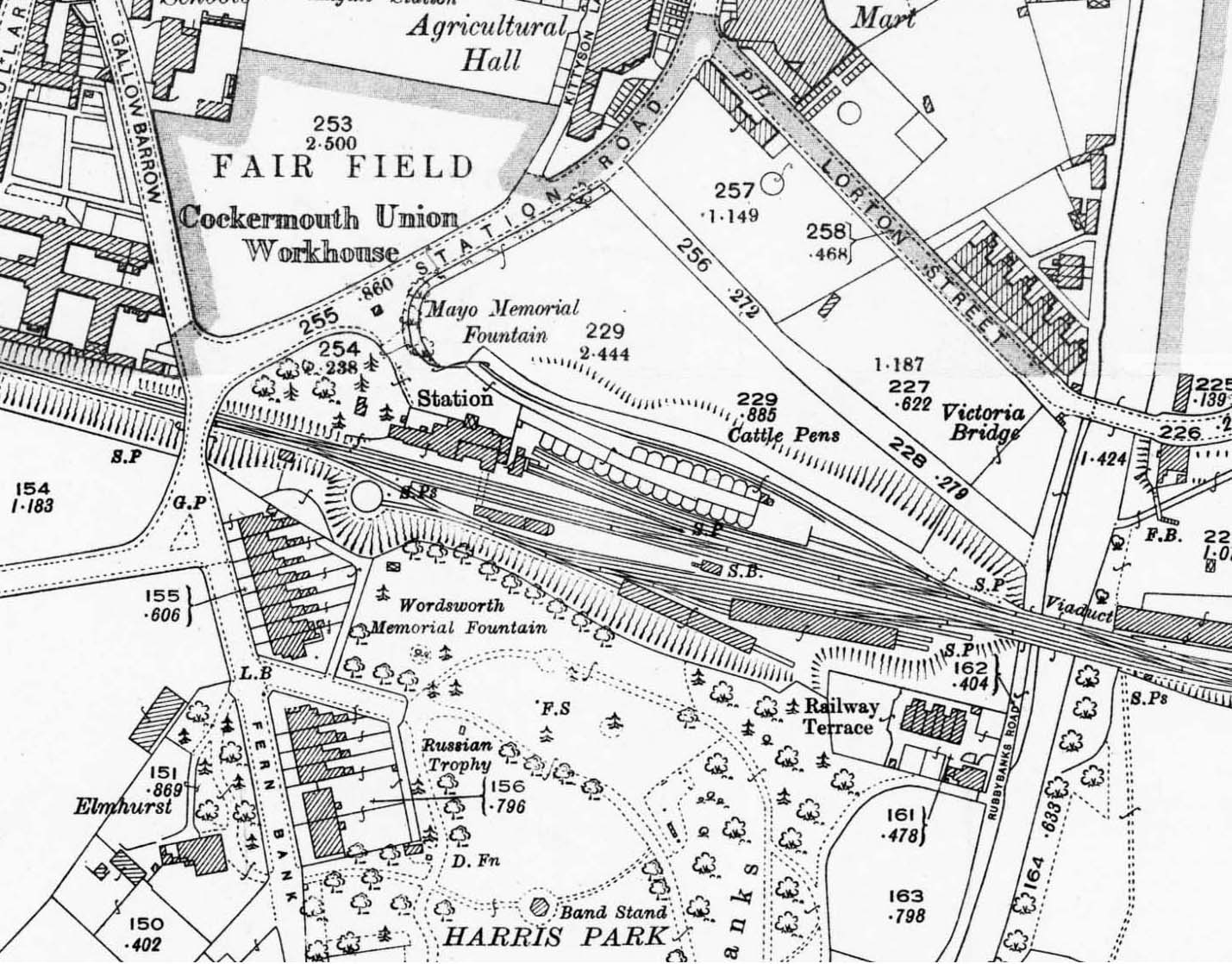1923 1: 2,500 OS map. Cockermouth station is shown in its prime. The station building and up platform are north of the running lines with sidings trailing in from the cattle loading dock and pens. The island platform is shown with its more modest buildings and a signal box towards the east end. Sidings to the south of the running lines serve a two-road carriage shed, a one-road goods shed and a turntable. Double track ends a short distance west of the bridge under Station Road. Apart from livestock all goods traffic was handled at the site of the original Cockermouth station, and this would coontinue until the closure of the route through Cockermouth to all goods traffic in 1964.