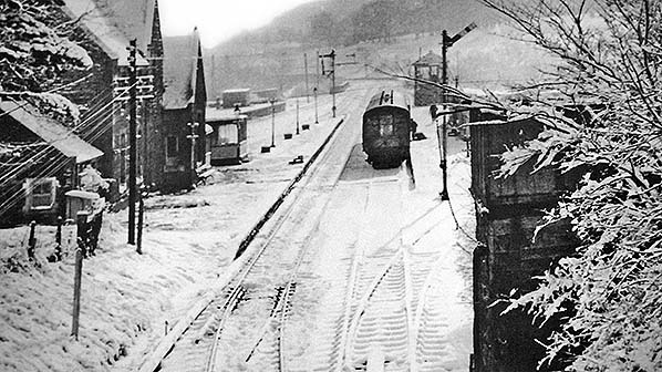 A Derby Lightweight 79xxx series DMU bound for Workington is seen from Station Road bridge in April 1966. Note the wooden steps on the platform alongside the guard's van. The steps were used to assist loading and unloading of parcels etc from the van. All passenger trains had a stepboard beneath each door and in those days people made little fuss about having to clamber up and down. There was another set of steps on each platform for passenger use.