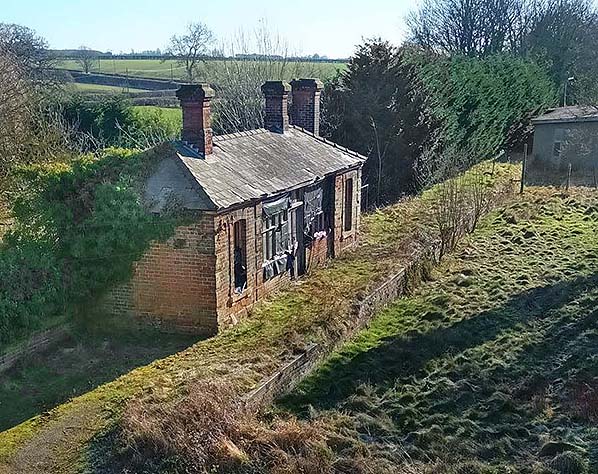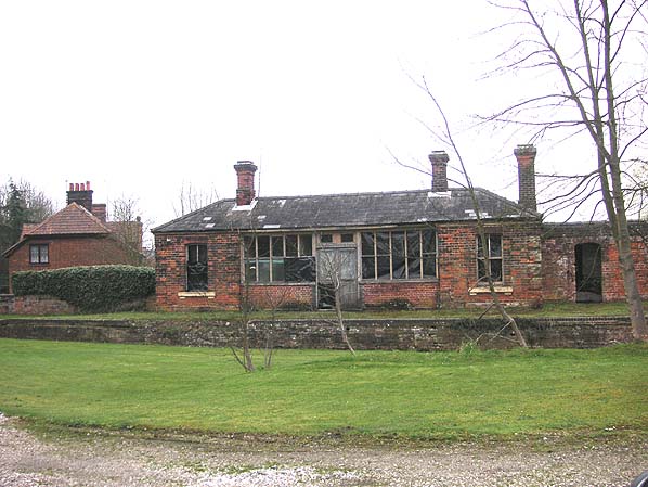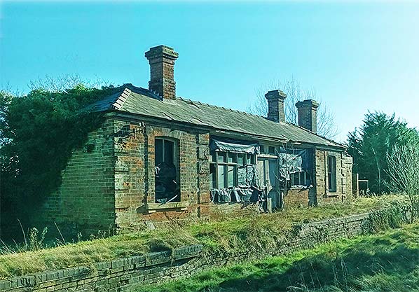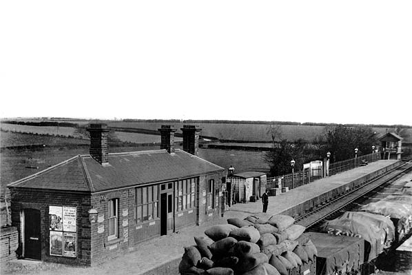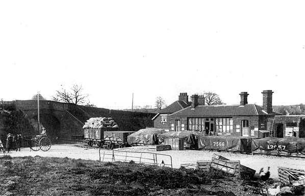 Cockfield handled a full range of goods traffic from the small yard opposite the platform, this comprised a single siding with a cattle dock. F J Jennings' private siding ran from the yard to the adjacent Cockfield Hall. The hall, which was demolished in 1888, was bought by the renowned Newmarket trainer Thomas Jennings in 1865 and turned into a stud farm. He built the southern block of the buildings for use as mares boxes with an exercise yard, and the eastern strip as a cart lodge with a granary over it. The western side was the working horse stables and chaff house. When the railway came through in 1870 a siding was provided terminating under it so that grain sacks could be lowered into wagons. The siding was also used for bringing in cattle from Wales and animal feed in the form of sugar beet pulp from Bury St Edmunds. The siding was taken out of use c1940 when a tank trap was dug all the way along the western side of the line as part of our wartime defences. This were backed up with the row of pillboxes manned by the Home Guard.
