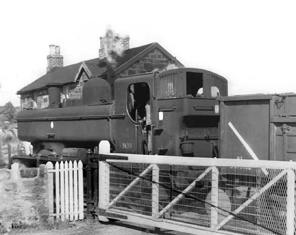 ![]() The level crossing west of Coed Poeth station is seen in the early 1960s as locomotive number 9630, without its cabside number plates, works a train towards Minera. The ex-GWR 57XX locomotive was built at Swindon in December 1945 and had a working life of well over 20 years. It was withdrawn from Croes Newydd shed in September 1966 and scrapped by Cashmores of Great Bridge in December of that year. ![]()
