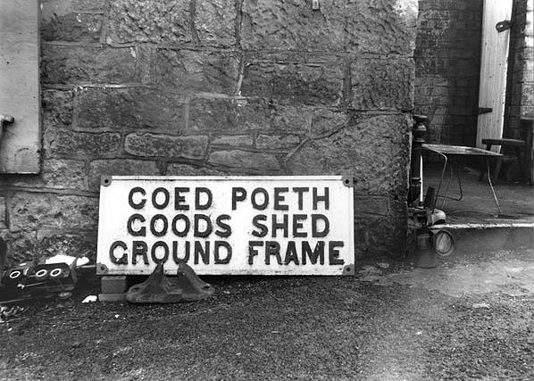 The Coed Poeth goods shed ground frame sign seen at Vicarage Crossing in February 1980.