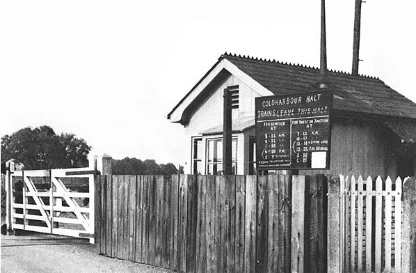 Coldharbour Halt level crossing and signalbox in the 1950's. Note the hand written sign.