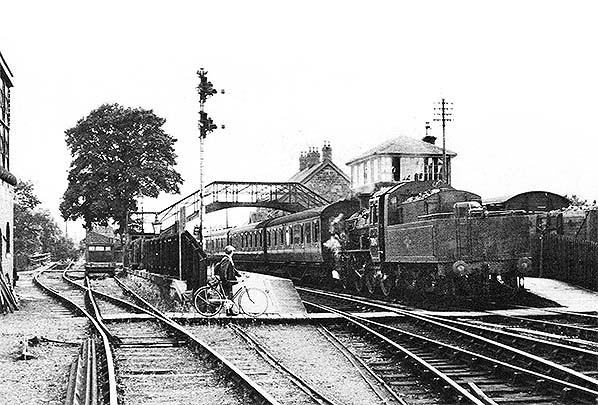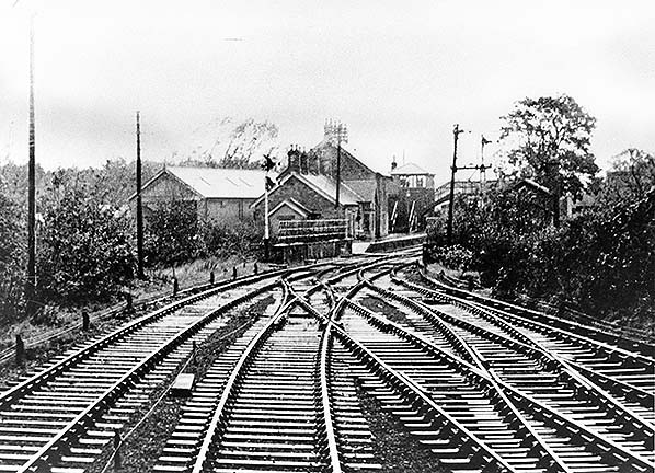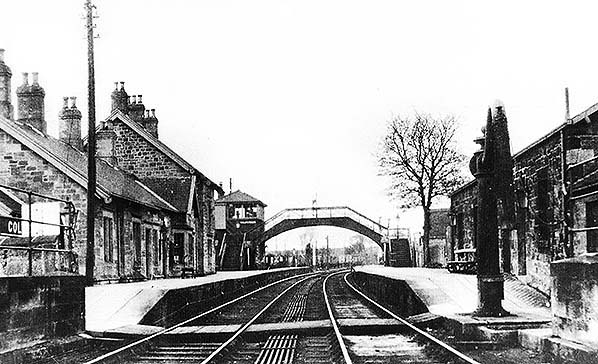 ![]() Coldstream station looking north. The dark paint on the nameboard (far left) suggests that it is still in LNER livery before being repainted in tangerine by BR North Eastern Region, so the date is probably 1940s or very early 1950s. In this useful general view the buildings on both platforms are clearly visible, as are the NER signal box and footbridge and the water crane in the foreground at the down platform ramp. Prominent in the ‘four foot’ between the tracks is the rodding to operate the points beyond the southern end of the platforms.