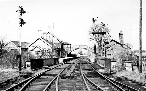 ![]() Looking north towards Coldstream station in March 1955. The signal (right) is set for a down train (towards Kelso). The bridge in the foreground is over the A697 road.