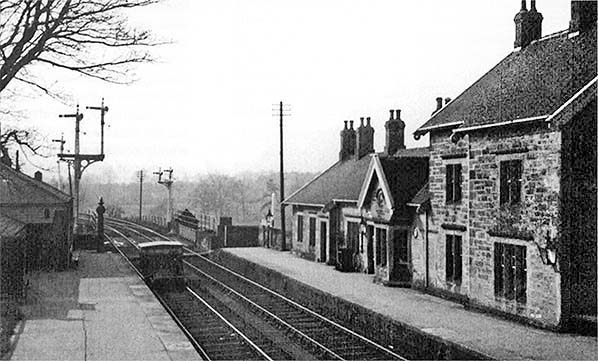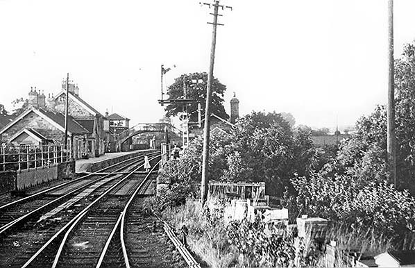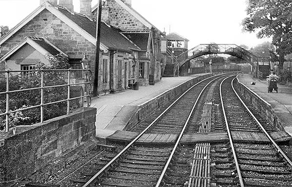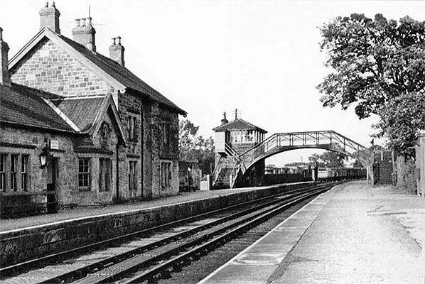 ![]() Coldstream station looking north from the down platform c1960. On the up platform the YNB-built stationmaster’s two-storey house and the contiguous single-storey office range can be seen, with the NER signal box and footbridge beyond. Rakes of wagons are in the goods yard.