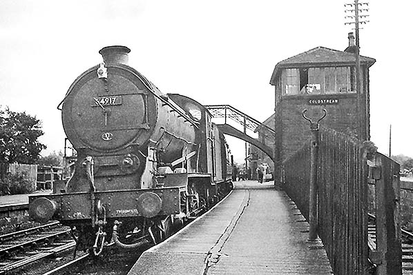 ![]() A local passenger train bound for Tweedmouth and Berwick-upon-Tweed pauses at Coldstream station on 28 June 1957. On this platform the NER signal box is prominent, and in the foreground a post has been relieved of its lantern. Far right is a siding and loading bank. The Gresley J39 0-6-0 No.64917 was built in October 1936 by Beyer Peacock and would be withdrawn from 52D, Tweedmouth shed, in December 1962 to be cut up at Darlington Works, North Road in July 1963.