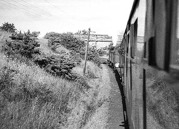Copyright photo by RM Casserley ![]() Looking south at Coldstream station in September 1958. BR Standard 2MT 2-6-0 No.78047, one of two regulars on this line - the other being No.78049 – is hauling a local train towards Tweedmouth and Berwick-upon-Tweed. New in October 1955 No.78047 was shedded at 64G, Hawick, until 1965 so has presumably worked through from St Boswells. The signals seen here are now upper quadrant with metal arms mounted on a steel post; although installed by BR, the signal arms are to an LNER pattern. The leading two carriages are a Thompson Non Corridor Lavatory Composite and the second a Gresley steel-panelled Five Compartment Brake Third. The third vehicle is a BR Mk1 BG (BG = Full Brake, Gangway, i.e. with corridor connection); it will be carrying parcels and sundries. In the siding behind the platform, left, lurks a platelayers' motor trolley complete with trailer. The bicycle is also of note: proper chain guard, full mudguards, pump, saddlebag, dynamo-driven, lights - very much of its time. There was no engine shed at Coldstream but there was a turntable at the end of the siding