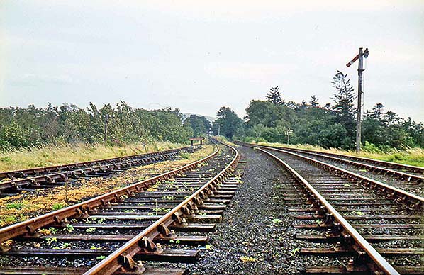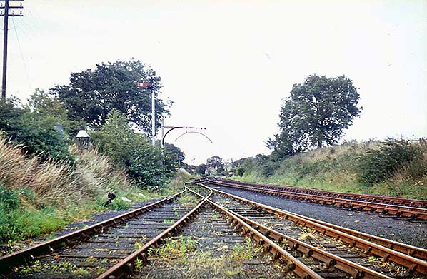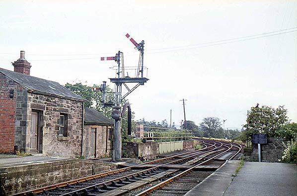 Photo by Morrison Halbert from Roy Lambeth collection / ARPT collection ![]() Trackwork of the Berwick – Kelso line and sidings near Coldstream c1964. The loading gauge at the entrance to the goods yard is seen on the left.