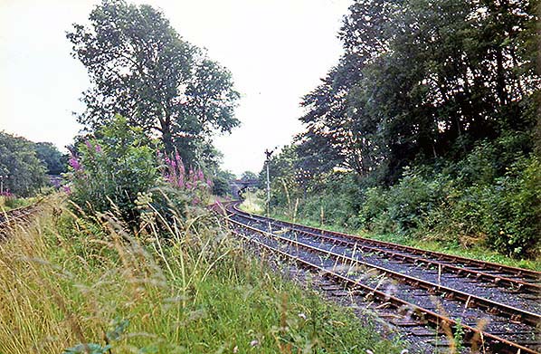 Photo by Morrison Halbert from Roy Lambeth collection / ARPT collection ![]() Looking south c1964 beyond Coldstream station towards the divergence of the double-track line to Kelso (right) and the single track to Wooler. The Wooler line is on a gradient of 1 in 133 as it rises to breast a low watershed between the Tweed and Bowmont valleys, whilst the Kelso line from which the photo is taken is falling at 1 in 1320.