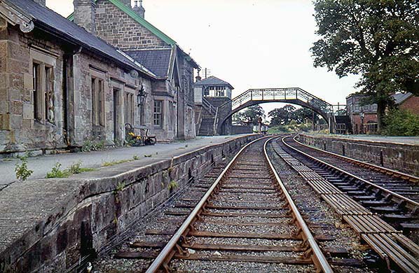 Photo by Morrison Halbert from Roy Lambeth collection / ARPT collection ![]() Coldstream station looking north c1964. The photograph has been taken shortly before or after closure to passengers. The full range of buildings including the signal box and footbridge is in place, but weeds are appearing on the platforms.